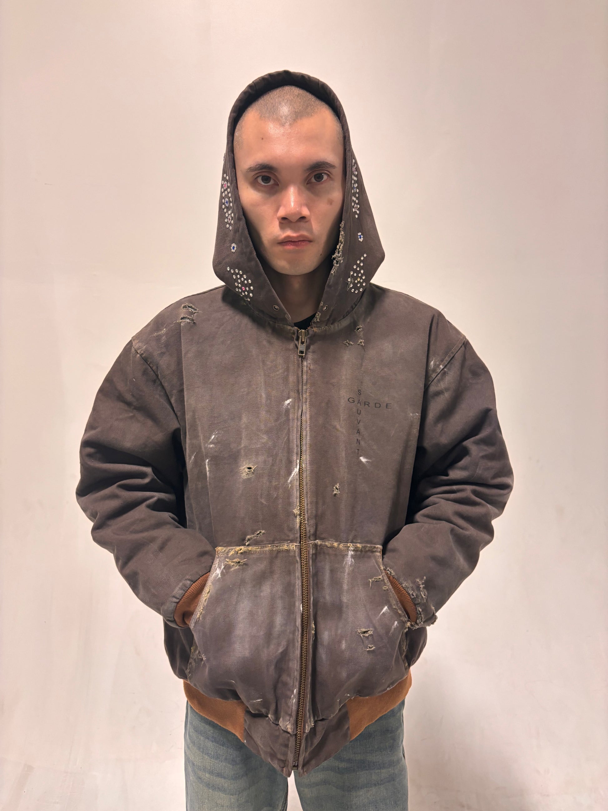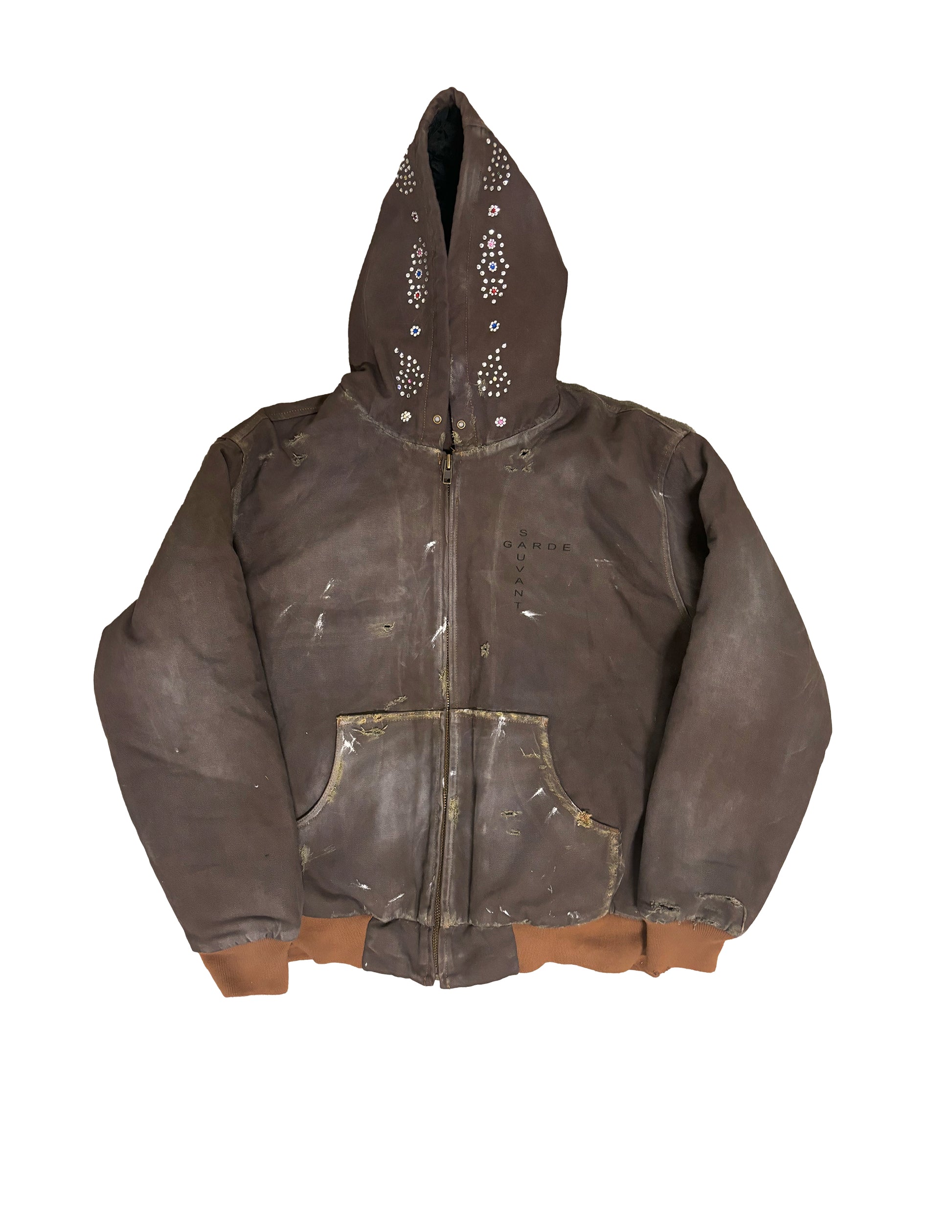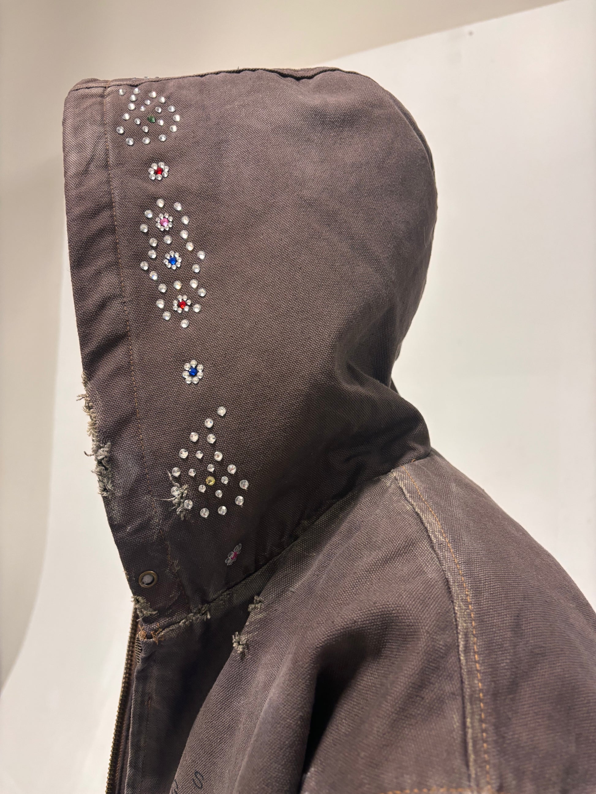 - Jacket includes a hood with brass eyelets and embellished with rhinestones
