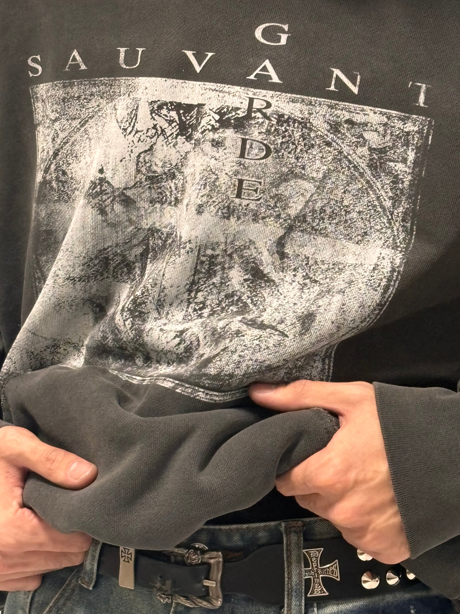 - Hand distressed detailing along hoodie